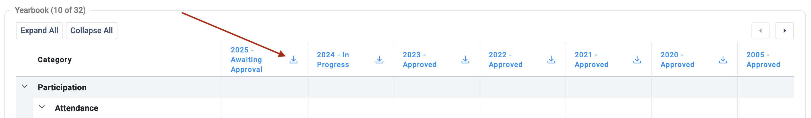 To download a PDF of a yearbook report for a congregation, go to the church record page. Scroll down to the Yearbook grid. Click the download icon in the column heading for the year you want to download.